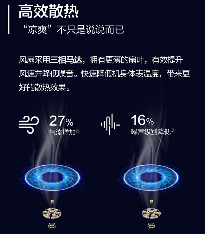 与此同时,它还搭载了加强版的三相马达使其得以高效散热,扇叶更薄,风速提升27%的同时还带来了16%的降噪效果,可有效降低机身体表温度,带来更好的散热和静音效果。