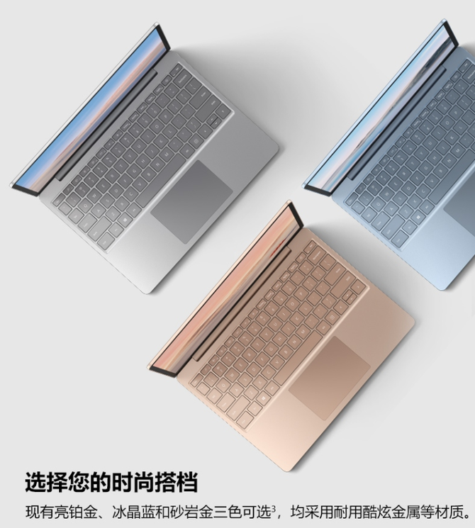 Surface Laptop Go有冰晶蓝、砂岩金和亮铂金三色可选,拥有高性价比的同时彰显年轻时尚个性。拥有 12.4 英寸 PixelSense 触控显示屏,配合超窄边框设计,能够在浏览学习资料时获得更佳视野。精确的大触控板和 1.3 毫米键程的全尺寸键盘,可以提供全天高效舒适的输入体验,让工作学习效率倍增。