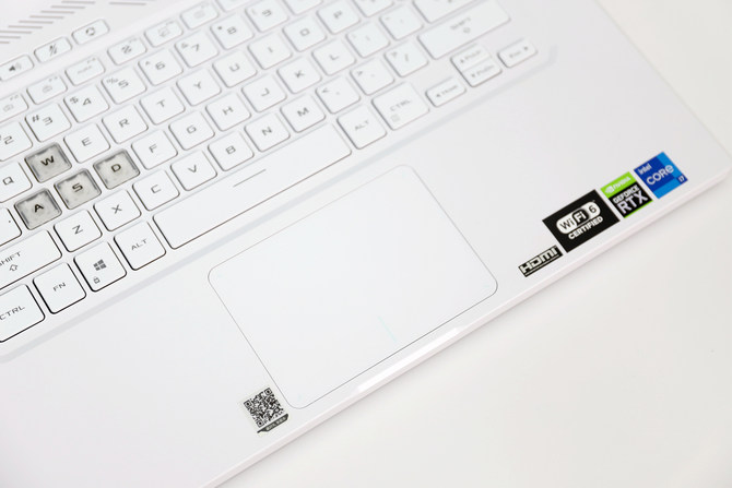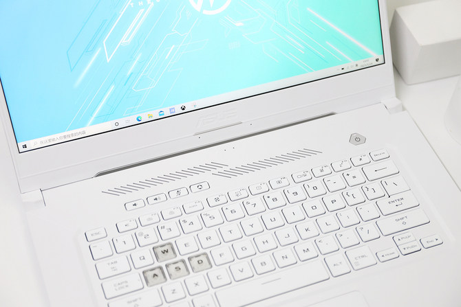 C面采用三档可调青色背光键盘,WASD与其它按键设计区别明显,虽然提升了精准操控性,但在纯白色的键盘区显得有些突兀。全尺寸键盘,1.7mm的舒适键程,纯白的按键手感非常细腻而有质感,而且方向键也被独立加大,操控体验相当不错,此外,键盘的按压寿命高达2000万次,无论是打字输入,还是游戏,这款键盘的表现足够完美。