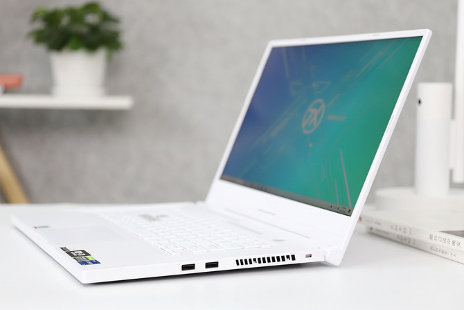 相比上一代的天选游戏本,这次全新推出的天选Air笔记本在机身设计上,可谓是画风突变,除了这款月耀白,还有一款日蚀灰。外观磨具相比上一代天选轻了约10%、厚度也仅有19.9mm,面积缩小了约20%。