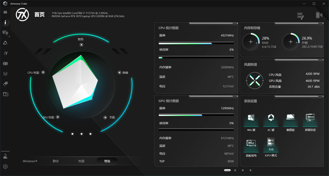 历经数次迭代的Armoury Crate已经成为华硕电竞产品功能强大的控制中心,通过Armoury Crate,不仅可以随时查看电脑硬件当前的性能消耗,还可以根据当前使用场景,将你的产品一键设置为增强模式、性能模式、静音模式、Windows模式,包括游戏库管理,游戏视觉设置等的个性化设置。