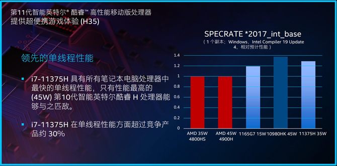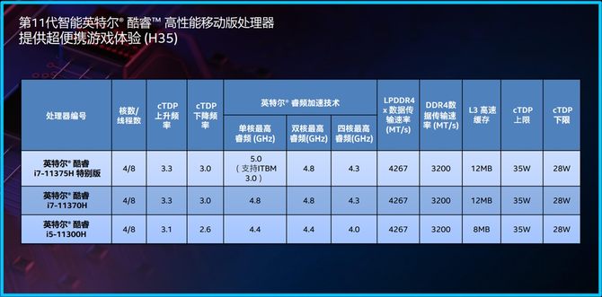 第11代智能英特尔® 酷睿™ i7-11375H特别版处理器,特别之处就是专为轻薄游戏本释放更强动力和更高性能进行优化。这款处理器采用10 纳米 SuperFin工艺,属于Tiger Lake-H35 系列,该系列还包括i5-11300H和i7-11370H一共三款。这三款处理器均采用4核心8线程设计,内置锐炬 Xe 核显,最高TDP 35W,但是i7-11375H采用英特尔® 睿频加速Max 3.0 技术,能够带来高达 5GHz 的睿频频率。
