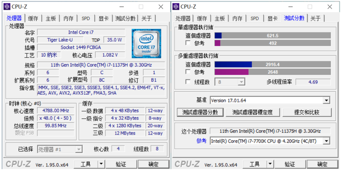 CPU-Z软件基准测试单核得分621.5,多核得分2916.4,对比列表内的i7-7700K桌面处理器提升明显。