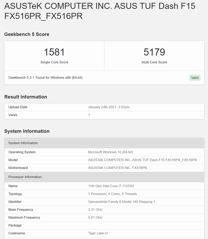 Geekbench是一个兼容多平台的综合性测试工具,主要考察CPU和内存系统的运算能力。i7-11375H处理器在这次测试中单核得分1581,多核得分5179。单核得分对比我们此前评测的锐龙7 4800H处理器提升将近12%。