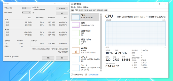 7-Zip是一款支持多线程压缩的软件,对大文件的解压缩效率同样能够考察CPU的性能。运行2分钟,此时的CPU利用率为100%,频率4.29GHz。总体评分达到了37906MIPS,在大文件压缩、解压缩能力方面,这款i7-11375H的表现令人满意。