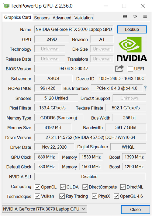 这款RTX 3070移动GPU采用第2代RT Cores和第3代 Tensor Cores的全新NVIDIA Ampere架构,可为玩家带来逼真的光线追踪效果和先进的 AI 功能。GPU-Z目前还不能完全识别,但是可以看到显存为8GB GDDR6,256总线带宽,5120纹理单元,频率1390MHz。