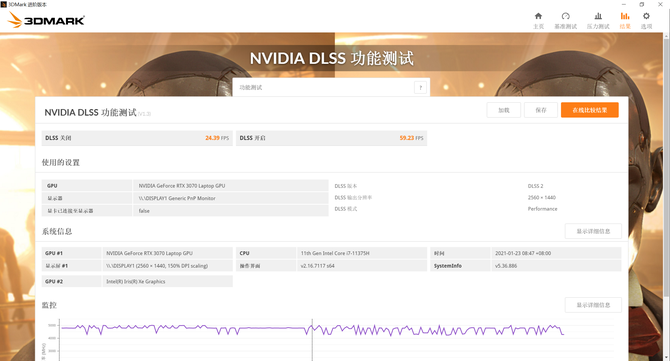 NVIDIA DLSS是由Tensor Core提供算力支持的一项突破性AI渲染技术,可让笔记本电脑在同等功耗下,展现出更强大的性能。该测试主要测试DLSS性能和图像质量,DLSS版本2.0,输出分辨率2560×1440,DLSSA模式为Performance。当DLSS关闭时的结果为24.39,DLSS开启时为59.23FPS。