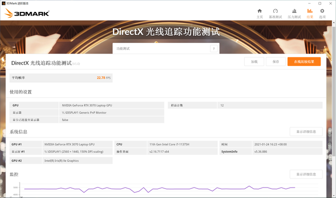 DirectX光追可以帮助游戏开发者创建逼真的反光、阴影以及其它通过传统渲染技术很难达到的效果。该功能测试纯光线追踪性能,测试的结果取决于显卡的整体光线追踪性能,最终平均帧率为22.78FPS。