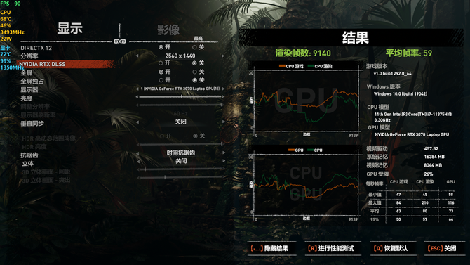 另外测试的游戏是《古墓丽影:暗影》,在关闭DLSS和光追效果时,渲染帧数9140,平均帧率59FPS。