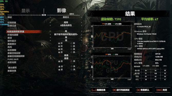 开启DLSS,设置光线追踪阴影质量为高,渲染帧数7390,平均帧率47。能够流畅运行,并获得更好的视觉效果。