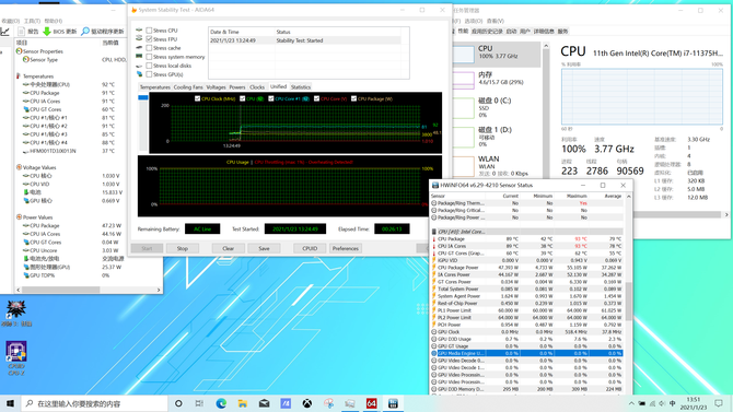 使用AIDA64的FPU进行单烤,室温23°C,连续运行26分钟,CPU温度最高93°C,正常在90°C上下,功耗47.23W,频率3.77GHz,下降并不多。笔记本C面后部位置手感温度较高,但好在避开了键盘区,所以在操作时并不会感到不适。