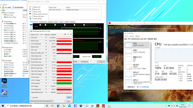 待笔记本冷却稳定后进行双烤,运行AIDA64 FPU,FurMark GPU测试,分辨率1920×1080,运行20分钟,GPU功耗80.26W,温度76°C左右;CPU功耗34.77W,温度89°C,频率3.33GHz,双烤同样无压力。