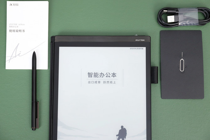 包装内除了讯飞智能办公本X2主机一台,还配有一支讯飞专门定制的4096级压感无源电磁手写笔,此外还有一根Type-C数据线,卡针,说明书等附件。需要说明的是,智能办公本X2还标配了皮质封盖和笔套,不用的时候合起来,既能自动关闭屏幕节省电量,还能起到保护屏幕的作用,而且手写笔也能随身携带。