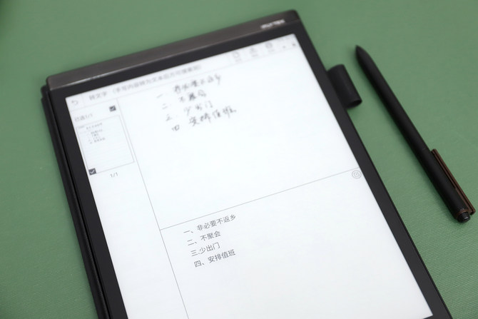 讯飞智能办公本X2采用了10.3英寸E-Ink柔性墨水屏,而且拥有0.1mm悬空屏专利技术,分辨率1872×1404,227ppi,16级灰度,纸质触感,表面磨砂处理。相比上一代,在屏幕的外观上有了很大变化,不仅边框做了瘦身,还在上边框加入了条状的装饰,内置扬声器和四麦克风阵列,可以用于播放录音或听书,以及高清晰度录音。