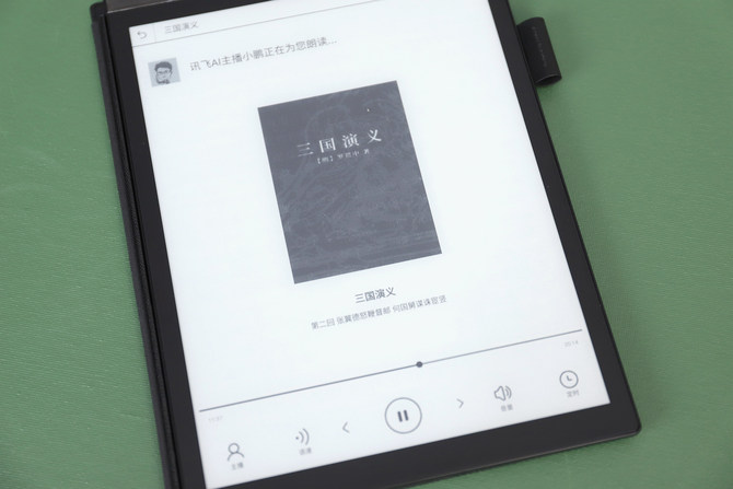 此外,讯飞智能办公本X2采用讯飞语音合成技术,支持AI模拟真人声音,不同于机器合成声,可朗读书籍、新闻、网文等,抑扬顿挫、惟妙惟肖。用户可以在听读界面选择主播,有男声和女声,支持语速和音量的调节,如果晚上睡觉前听,还可以设置定时,在阅读一定时间后停止。