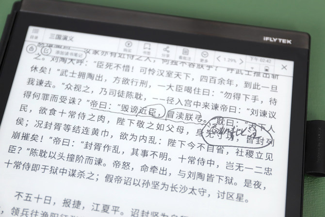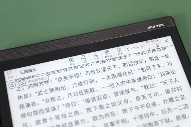 除了强大的手写和语音转换、翻译功能,讯飞智能办公本X2还支持电子阅读功能,自带讯飞、当当两大书城,数十万优质图书资源,其中数万册免费。支持的书籍格式有PDF、EPUB,TXT,MOBI,以及Office文档:DOC,DOCX,XLS,XLSX,PPT,PPTX等,而且在阅读时还支持字号大小设置,对比度设置,以及在阅读中的批注等功能。不过比较遗憾的是,这款办公本不带背景光,所以想要在晚上光线不好的环境里看书,是一件比较困难的事儿了。