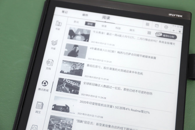 值得一提的是,讯飞智能办公本X2还支持绑定百度网盘,关联后可下载网盘阅读资源至本地。此外,还自带腾讯新闻,通过网络获取即时新闻资讯,随时掌握更多信息。