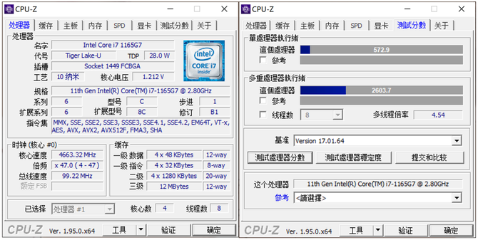 运行CPU-Z测试结果显示,单核得分572.9,多核得分2603.7,无论单核还是多核,对比第10代i7-1065G7处理器都更加优秀。