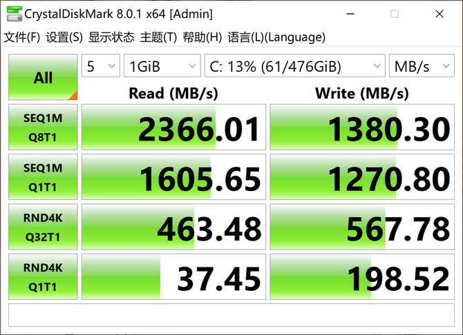 硬盘存储方面,这款笔记本配备了三星NVMe接口的固态硬盘,容量为512GB,顺序读取速度为2366MB/s,写入为1380MB/s,能够满足日常大文件数据的传输需求,以及确保系统快速启动。