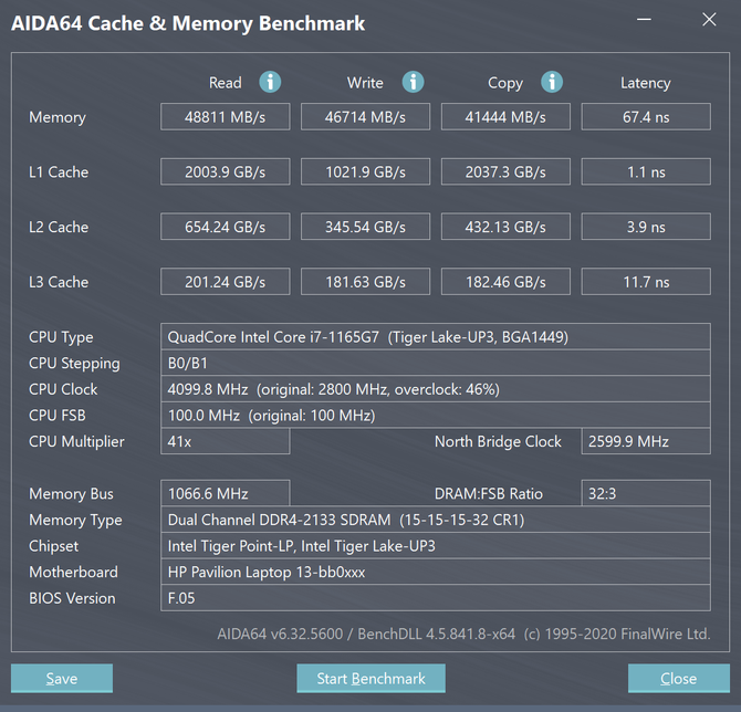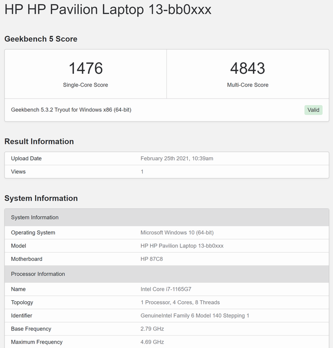 GeekBench 5是一个支持多系统的CPU跑分平台,主要用来测试CPU单核以及多核的性能水平,包括办公、娱乐等应用场景,以及在增强现实、机器学习等新应用领域的性能。这款酷睿i7-1165G7在Geekbench 5.3.2平台上的跑分,单核成绩1476,多核成绩4843。与上代i7-1065G7相比,睿频由3.9GHz提升到4.4GHz,缓存8M变成12MB,在GeekBench 5上的跑分同样领先。
