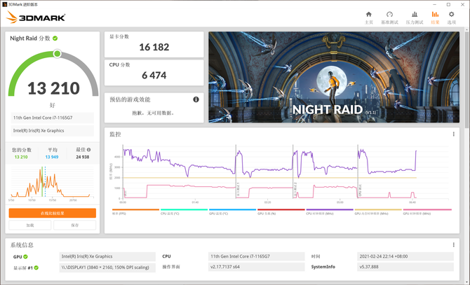 正是因为集成的锐炬Xe显卡,所以在3DMark Night Raid的测试中,显卡分数达到16182,综合分数达到13210,相比上一代在图形性能方面提升可达50%以上,再一次验证了这款显卡在图形图像处理和游戏方面的性能,可堪当重任。