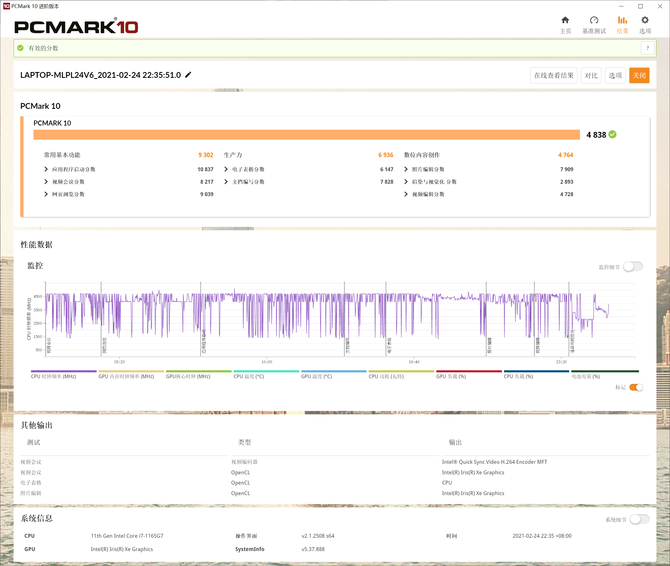 作为高效办公的生产力工具,日常工作无非就是网页浏览、文档处理、图片和视频编辑,以及社交应用等,星意宠粉本的强悍性能足以轻松运行。使用PCMark 10跑分也可以看出,其常用基本功能得分达到9302,生产力得分6936,数位内容创作达到4764,综合得分也达到了4838,成绩的背后已经显示了这款笔记本在现代办公场景下的得心应手。