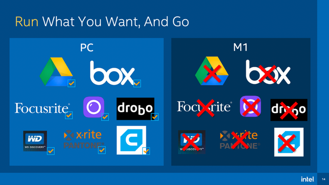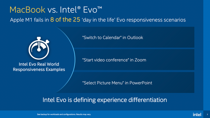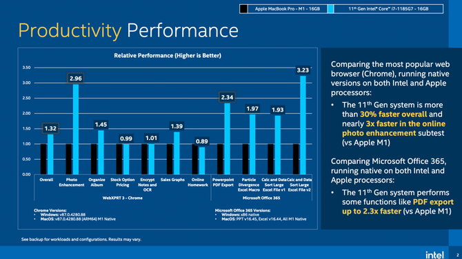 于是,就在近期,Intel专门向媒体分享了一组实验室对比数据,证明苹果芯片M1并非万能,Intel的处理器也依然很强劲。对比的对象一方是采用M1处理器的苹果MacBook Pro笔记本,另一方则是搭载Tiger Lake i7-1185G7处理器的某Evo笔记本,包括办公、内容创作、游戏三个方面。一起来看看吧。