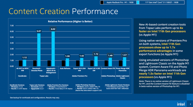内容创作方面,包括Handbrake、Topaz Labs、PR三款应用的对比上,涵盖了音频、图片、视频等多个方面,Intel均有不同程度的领先,在PR的测试场景中,包括了4K H.264的硬件转码,可以看到第11代Tiger Lake和M1相比最有72%的领先。除此之外还有Adobe的Photoshop和Lightroom,同样也有50%以上的领先。
