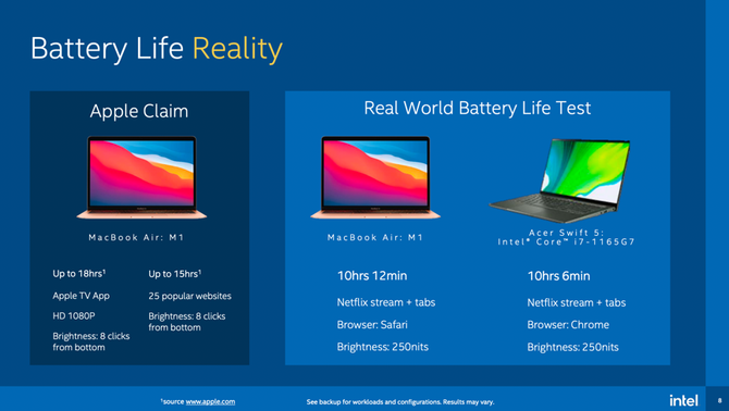 在电池续航方面,苹果的MacBook Air分别标识了15小时和18小时,而且特别讲到是屏幕亮度从最低的亮度向上调8格,就是125nits,这个时候的屏幕非常暗,甚至看不清屏幕上显示了什么。而Intel使用了Acer Swift 5做对比,将调整屏幕亮度到250nits,同时进行视频、上网测试,结果分别坚持了10小时12分、10小时6分。这一项的测试中,Intel显然还是让着苹果了,毕竟没有拿出续航时间更长的产品。这也意味着,M1已经很好,但是Intel绝对不差。