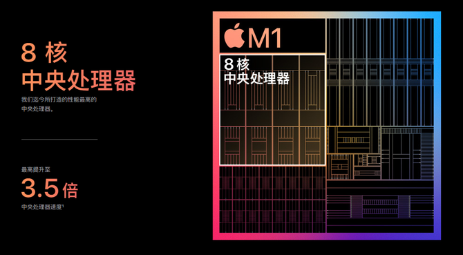 M1芯片的核心是一个8核CPU,采用了4+4大小核设计,每个内核都为单线程任务提供更好的性能保障,用苹果话说就是:这是世界上最快的低功耗CPU内核。此外,M1还集成多达8核的GPU,可以同时执行25000个线程工作,也就是说M1可以轻松处理很复杂的任务。根据苹果公司的数据,M1具有“世界上最快的计算机集成图形处理能力”,吞吐量为每秒2.6 万亿次浮点运算。不得不说,苹果芯片M1出手不凡,首发亮相就引起行业震动。