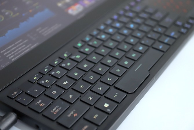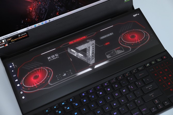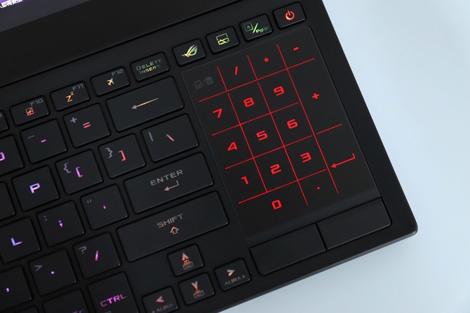 ROG冰刃5双屏的键盘采用了1.2mm键程的炫彩RGB灯效键盘,并且同样使用了小键盘和触控板二合一的设计,一键就能切换功能,充分利用了整个C面的空间,设计感非常强,同时键盘背光支持AURA神光系统,用户可以笔记本电脑内置的驱动进行设置,为玩家营造更好的电竞氛围。