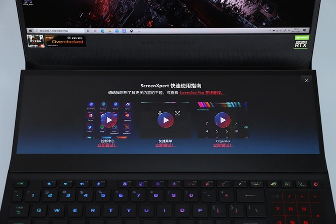 对于初上手的用户来讲,ROG冰刃5双屏游戏本提供了简单易上手的操作指南,我们可以通过指南进行快速学习,另外关于这块屏幕的作用,相当于一个拓展屏幕,在我们日常游戏的时候,可以在下方查看游戏攻略,在我们直播的时候,可以在下方屏幕观看弹幕或者回复玩家,总之,这款屏幕的作用可以根据自己的需求进行随意设定,日常用起来非常方便。