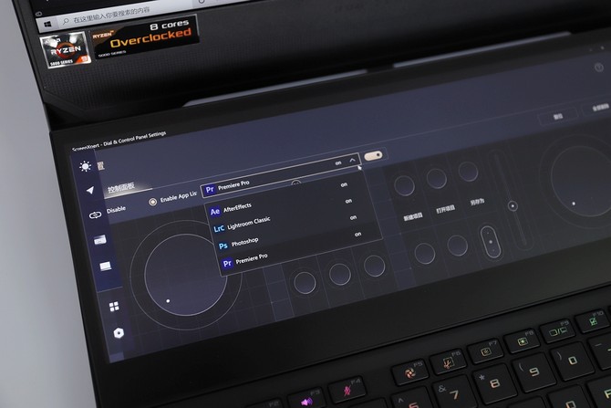 对于需要创作的用户,这款ROG ScreenPad Plus触控副屏还支持adobe全家桶,想要使用Pr剪辑视频,在主屏幕上显示Pr的主界面,而副屏上可以用于显示时间轴、素材库等窗口,或者是操控面板,就像是在编辑机上,通过虚拟的旋钮、按键开关、调节按钮等快速编辑,简直是太帅了。