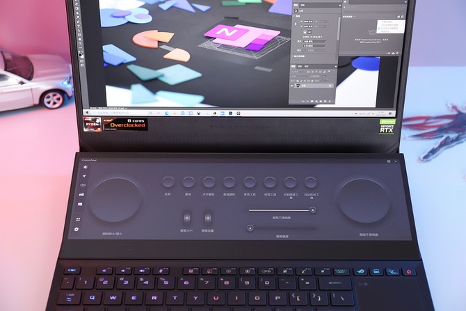 使用PS处理图片时,同样会相应地在副屏上显示控制面板,你可以通过虚拟的旋钮和快捷按键,去处理图层,对图片进行水平旋转、垂直旋转、套索、吸管、仿制等的操作,以及使用画笔进行涂抹等。也就是说,你可以使用鼠标在主屏上操作,同时也可以在触控板上配合操作,多管齐下,相比在一个屏幕上可是要快捷的多。毕竟,ROG ScreenPad Plus触控副屏可是针对adobe全家桶进行了深度优化,所以内容创作者就有福了。