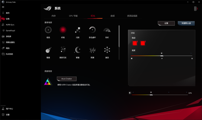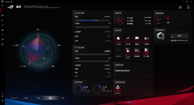 当然,ROG冰刃5双屏游戏本还内置了大家熟悉的奥创智能控制中心,在这里可以快速查看或设置系统的状态,以及管理ROG外设,键盘灯光设置等,让自己的ROG更加个性化。