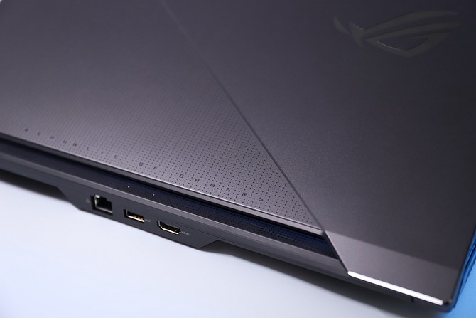 笔记本的正面采用的是斜切设计风格,给人的视觉感受更加凌厉,同时左下部分采用的半镂空的孔洞设计,细腻柔和。右半边是磨砂涂层,还有高端镜面的ROG“败家之眼”信仰LOGO。