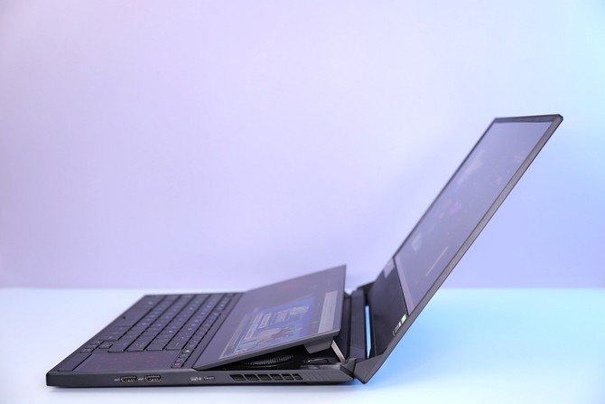 在整机的B面,ROG冰刃5双屏是一块4K高清IPS屏幕,屏幕尺寸为15.6英寸,同时支持120Hz高刷新率,3ms的超低相应,同时还支持100%sRGB高色域,以及经过Pantone专业色彩认证,无论是修图、视频编辑,或者是游戏,这块屏幕都非常的出彩,给你美轮美奂的视觉享受。