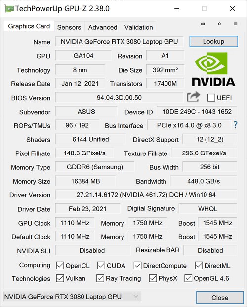 显卡方面,这款笔记本搭载了最新的NVIDIA GeForce RTX 3080显卡,在功耗控制方面更加出色,同时8nm制程和Ampere架构,让这款显卡的光追性能相对上代提升2倍左右,同时DLSS技术,让我们在游戏的时候,通过强化AI学习,带来更加流畅丝滑的游戏画面,是目前笔记本当中性能最强的GPU之一。