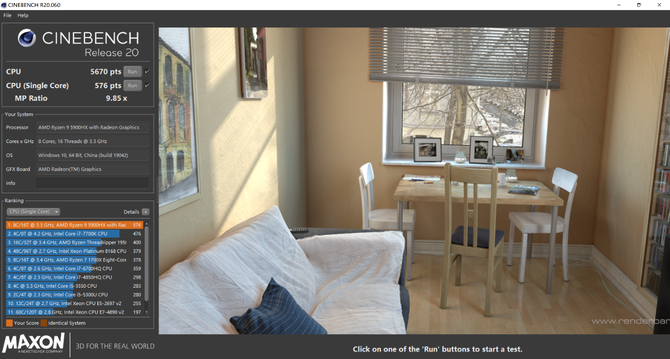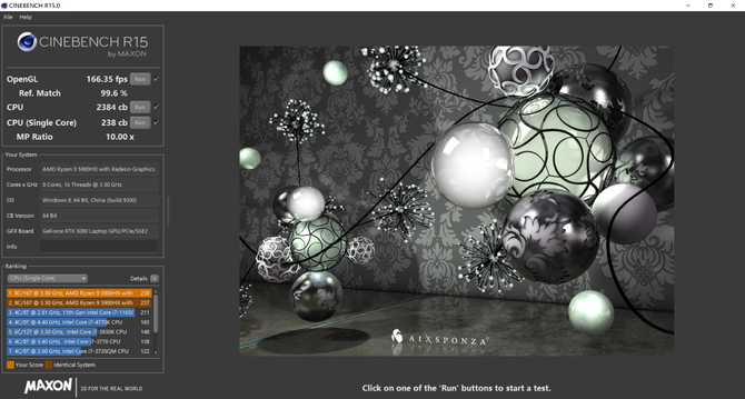 在CINEBENCH R15测试项目中,AMD 锐龙 9 5900HX的多核性能为2384cb单核心性能为238cb性能表现非常出色,在CINEBENCH R20中,这款处理器的多核心性能为7560pxs,单核心性能为768pxs,性能表现多领先市面上绝大部分的移动端处理器。