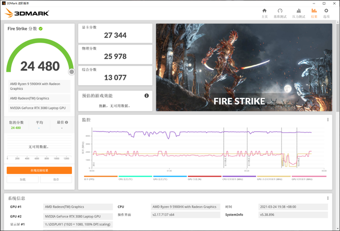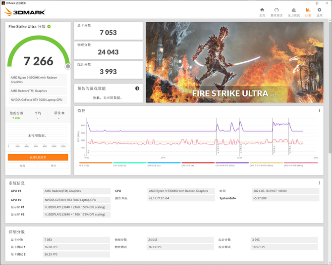 3DMARK是我们常用的一款基准性能测试软件,经过我们的实际测试可以看到,这款游戏本的FS、FSE和FSU成绩分别为24480、12906、7266,这样性能表现足够畅玩目前市面上绝大部分的主流游戏。