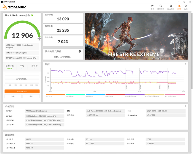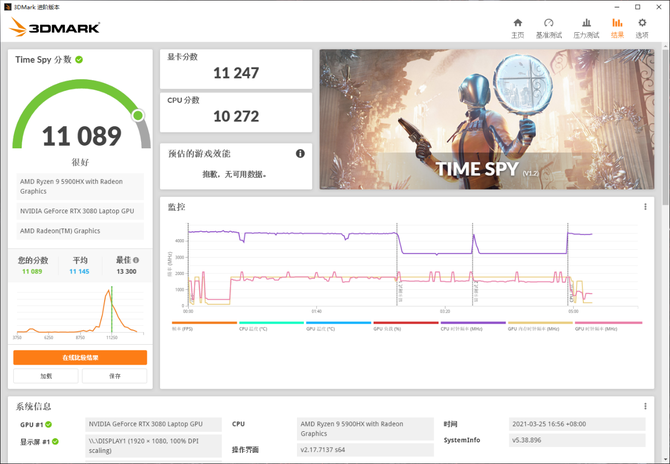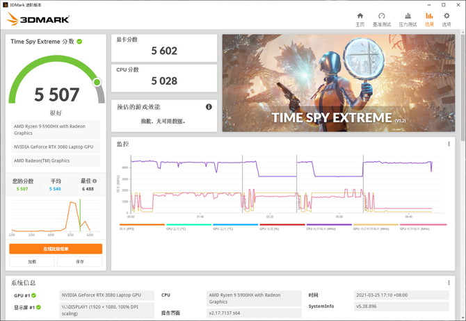 在DX12性能测试方面,ROG冰刃5双屏游戏本的最终测试结果同样达到极其优秀的程度,TimeSpy和TimeSpy Extreme成绩分别为11089和5507。