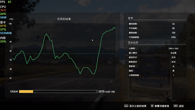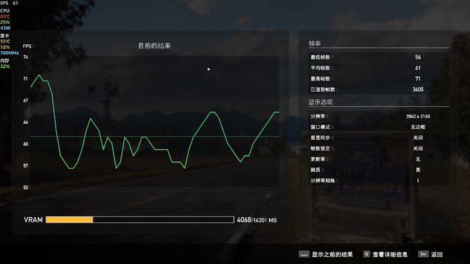 孤岛惊魂5游戏测试,最终2K分辨率下,游戏帧数为80,4K分辨率下游戏帧数为61,达到绝对流畅的运行标准,性能表现非常出色。