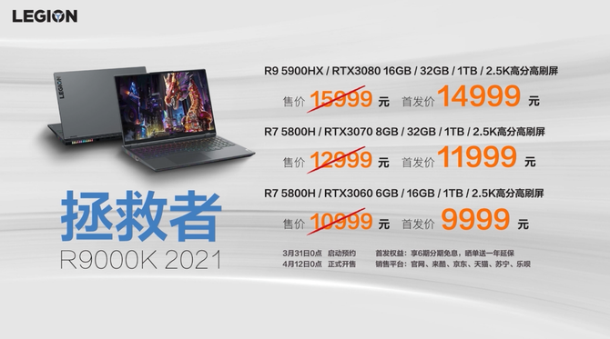 联想拯救者2021新品将在线上和线下全渠道销售,拯救者R7000P 2021笔记本首发价7499元,拯救者R9000P 2021笔记本首发价7999元起,拯救者R9000K 2021笔记本首发价9999元起,3月31日0点开启线上预售。