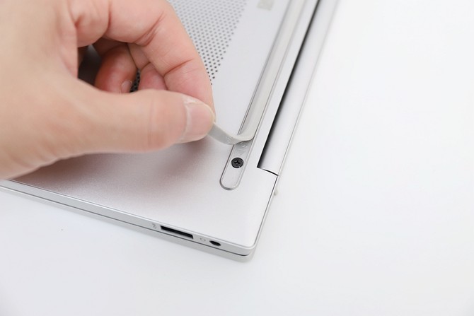 看完了星14高性能轻薄本的外观设计,接下来就进入到拆机部分,通过底部的图片也可以看到,底部露出的固定螺丝钉并不多,实际上却被巧妙的隐藏在胶垫下,所以这里轻轻揭开胶垫拧下螺丝即可。