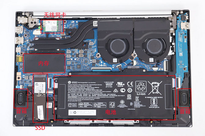 用撬片花开四周的卡口,很轻松就取下后盖,星14高性能轻薄本的内部一览无余展现在眼前。蓝色的主板被两个风扇占去了一半,所以主板其实很小的面积了。下部是电池部分。两侧是音箱,固态硬盘和内存条、无线网卡,也都一眼能见。机身内部的做工还是很工整,音箱的走线也都做了固定,没有多余的空间浪费。