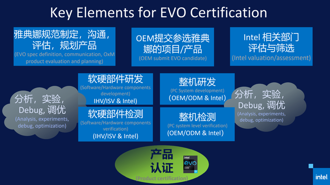 所有这些准备工作都做好之后,经过OEM、ODM整机开发伙伴的产品研发检测之后,就会走到最后一轮的产品的认证测试,如果这个产品经过这一系列的环节之后,它能通过各项认证指标的测试,那么英特尔就会颁发相应的认证证书。这也是整个Evo认证过程当中几个最主要的组成部分。