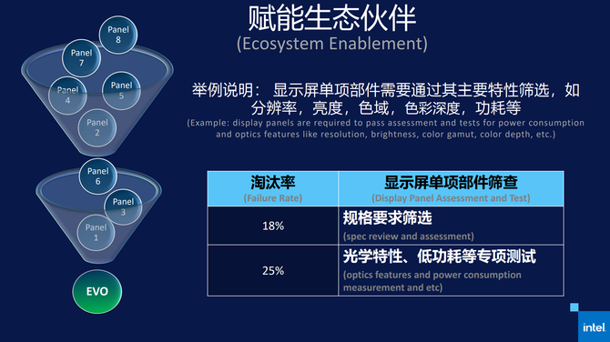 在这个不断筛选的过程中,整机开发商在选择零部件供应商的时候,在英特尔Evo平台认证的要求下会不同的项目无法符合规范需求而被淘汰,比如屏幕规格不符合淘汰率高达18%,不能通过光学特性、低功率等专项测试的有25%,而剩下的零部件在应用后还需要进行进一步的审核以达到英特尔的Evo标准。