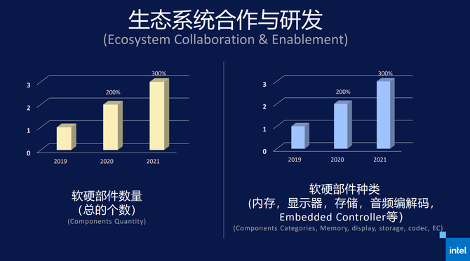随着英特尔雅典娜计划的不断推行,越来越多的零部件纳入到英特尔的合作和研发中,2020年软硬件单项部件的数量相比2019年翻了一倍,而2021年这个数量级还在继续增长。这意味着,英特尔的雅典娜计划、Evo平台认证将越来越有影响力,在新版本雅典娜规范标准之下,除了常规硬件之外,音频解码芯片、嵌入式控制器等部件也进入检测范围之内,未来,还有更多。