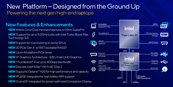 尖端的移动计算平台:第 11 代智能英特尔® 酷睿™ 高性能移动版处理器拥有先进的功能特性以及出众的连接性,可帮助创作者和专业商务人士随时随地展开工作,同时也使笔记本电脑端首次支持 20 条 PCIe Gen 4 通道。该处理器配置丰富,支持 4K HDR/Dolby Vision 视频流、快速存储、具备高性能和大容量英特尔® 傲腾™混合式固态硬盘、6GHz 频段的英特尔® Killer™ Wi-Fi 6E (Gig+) 以及每秒可实现高达 40 GB 传输速度的 Thunderbolt™ 4 技术,进一步提高了连接速度。