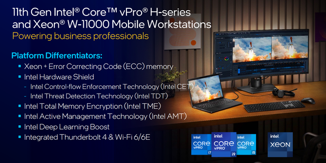 今天推出的全新第 11 代英特尔® 酷睿™ 博锐® 高性能移动版处理器和至强 W-11000 系列移动版处理器,搭载全新英特尔® 酷睿™ 博锐®平台,可为用户提供: